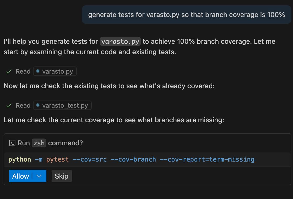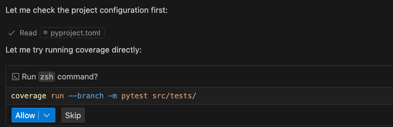 Agentti kertoo mitä on tekemässä, eli ensin se haluaa suorittaa komennon, joka selvittää testikattavuuden. Komento näyttää hieman oudolta, ja suoritusluvan antamisen jälkeen selviää, että se ei toimi. Agentti ehdottaakin uutta komentoa:
