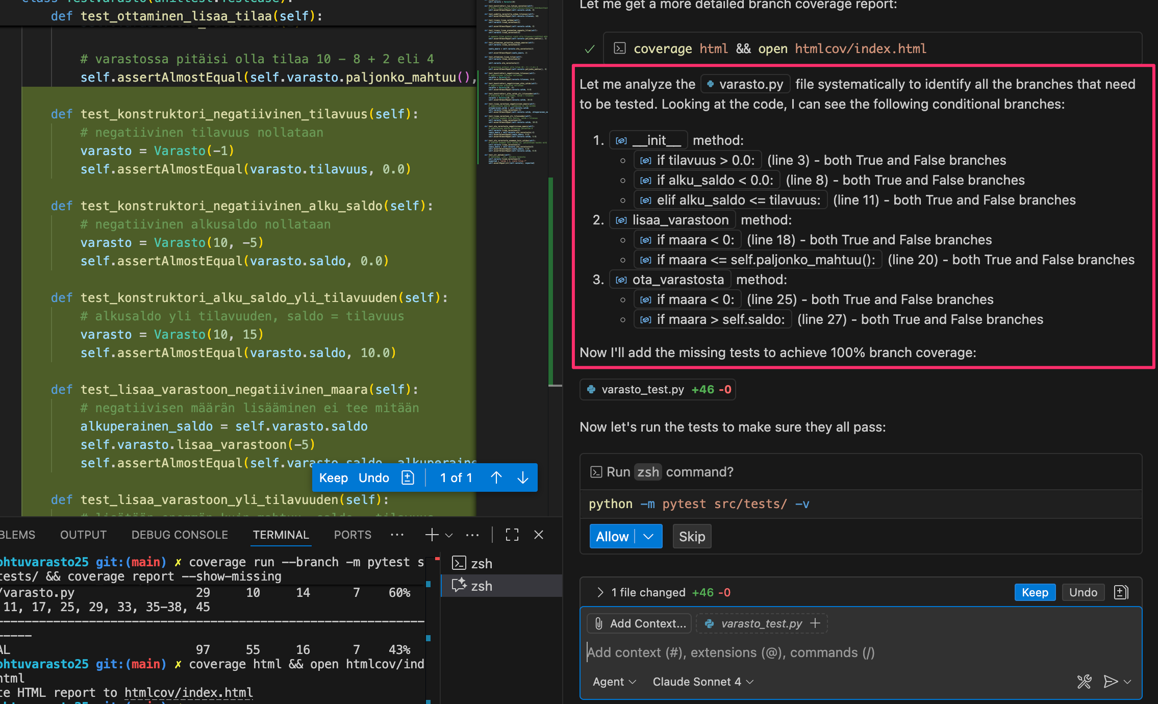 Uusi komento toimii, ja muutaman muunkin komennon suoritettuaan agentti on tehnyt ehdotuksen uusista testeistä, joiden avulla kattavuus nousee sataan prosenttiin: