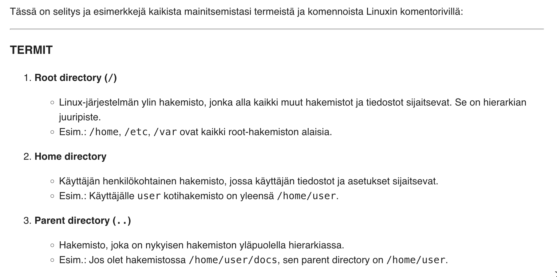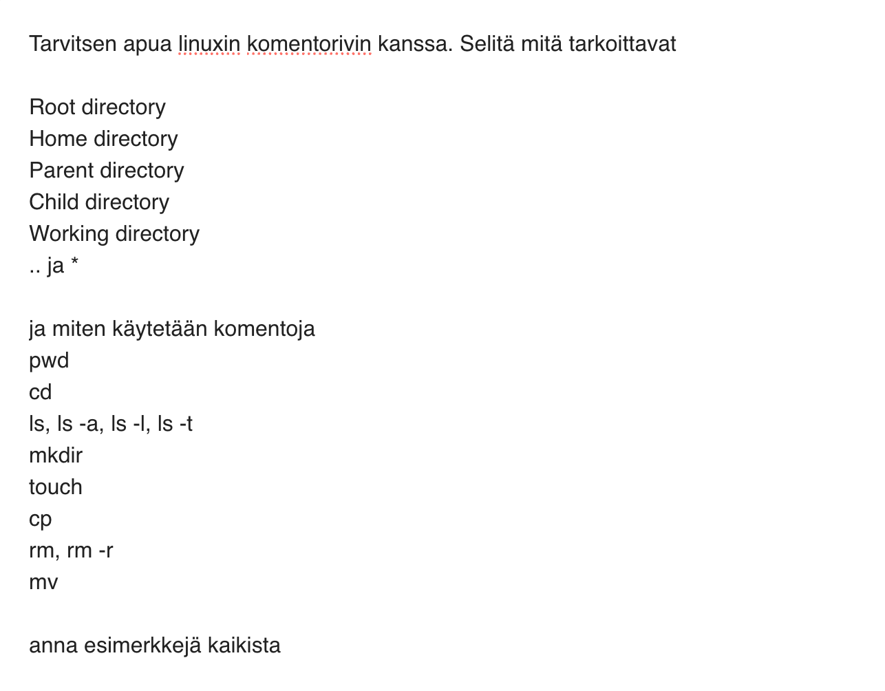 Tehtävässä on aiheena riittävän komentoriviosaamisen varmistaminen. Tehtävässä annetaan linkki muutamaan materiaaliin, näiden läpikäymisen sijaan voi pyytää ChatGPT:tä sopivaa oppimateriaalia aiheesta. Otetaan osa tehtävänannosta ja muotoillaan sopiva prompti: