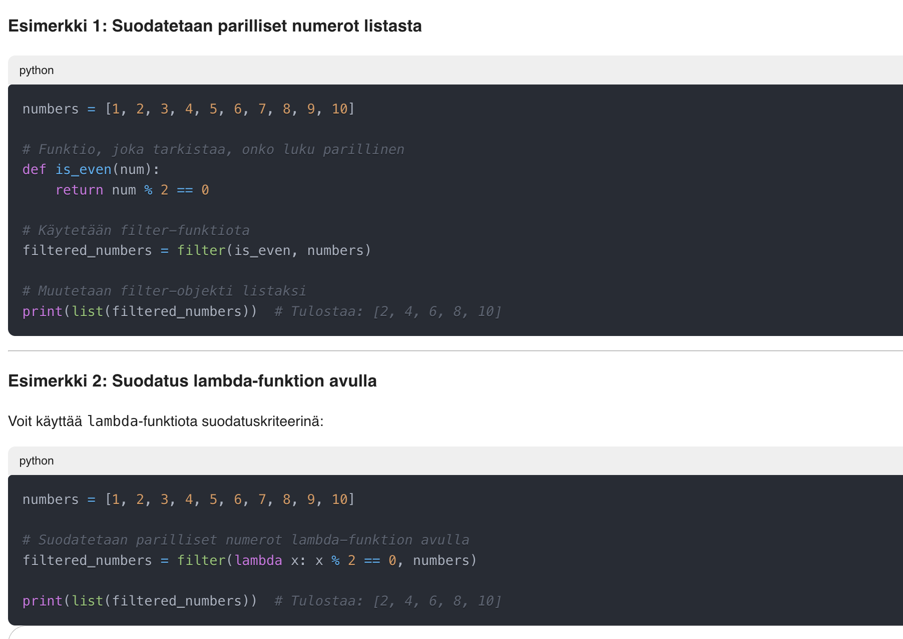 Vihje 2 kehotti tutustumaan Pythonin filter-funktioon. Dokumentaatio on kehnoa, kuten aika monesti Pythonin tapauksessa on.