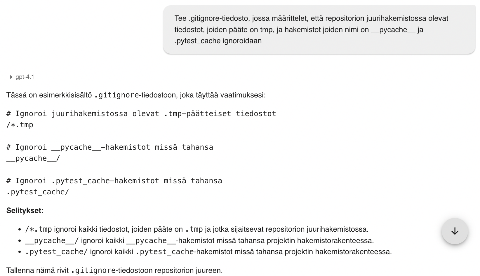 Kuten olettaa saattaa, AI osaa Gitiä varsin hyvin. Esim. sopivan .gitignore-tiedoston saa helposti: