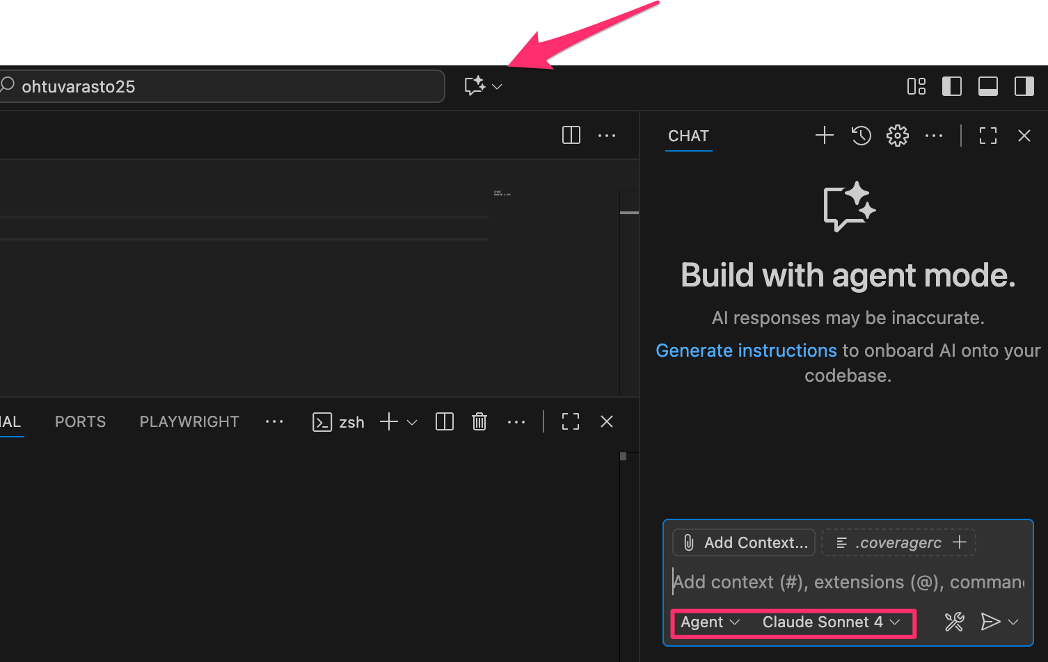 AI:n avulla on luonnollisestikin helppo generoida koodin lisäksi myös testejä. Chat-käyttöliittymän sijaan koodin ja erityisesti testien generointiin on parempi käyttää kehittyneimpiä välineitä, esim. VS Codeen sisäänrakennettua Copilot agenttimoodia. Agenttimoodissa tekoäly voi koodin kirjoittamisen lisäksi luoda tiedostoja, ja suorittaa koodia. Agenttimoodia käyttämällä tekoäly voikin yrittää korjailla ja parannella omia tekemisiään, ja koodarin ei tarvitse kopioida esim. koodin aiheuttamia virheilmoituksia tekoälylle.