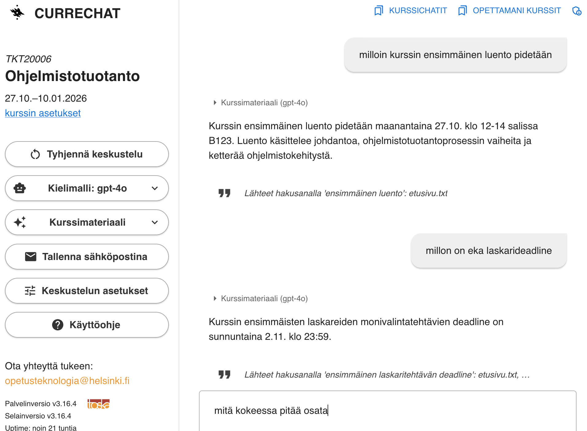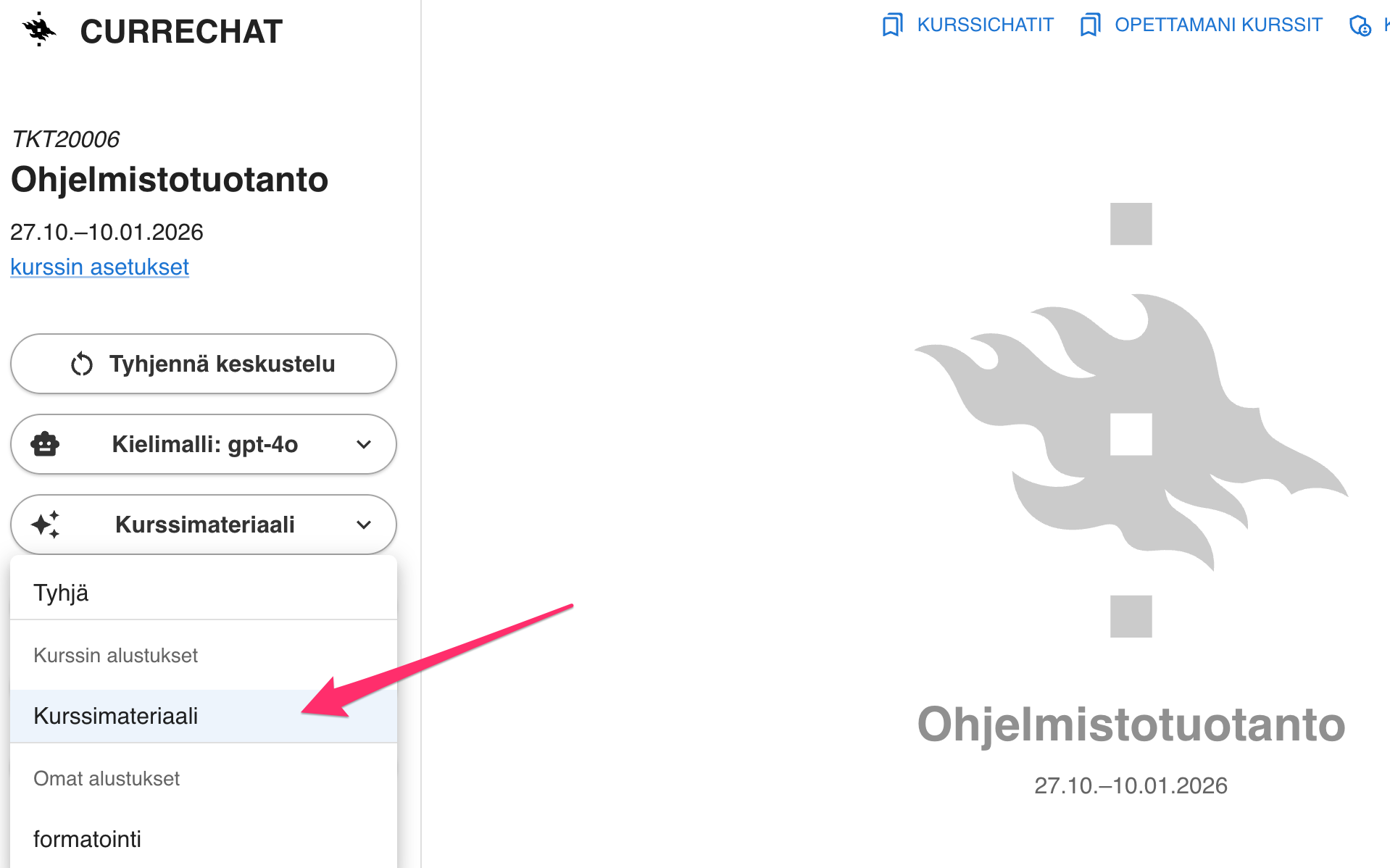 Chatia on mahdollisuus käyttää “normaalisti”, tai siten, että Chatin hakuindeksinä (ks. lisää täältä) on kurssimateriaali. Hakuindeksi otetaan käyttöön valitsemalla alustukseksi Materiaali:
