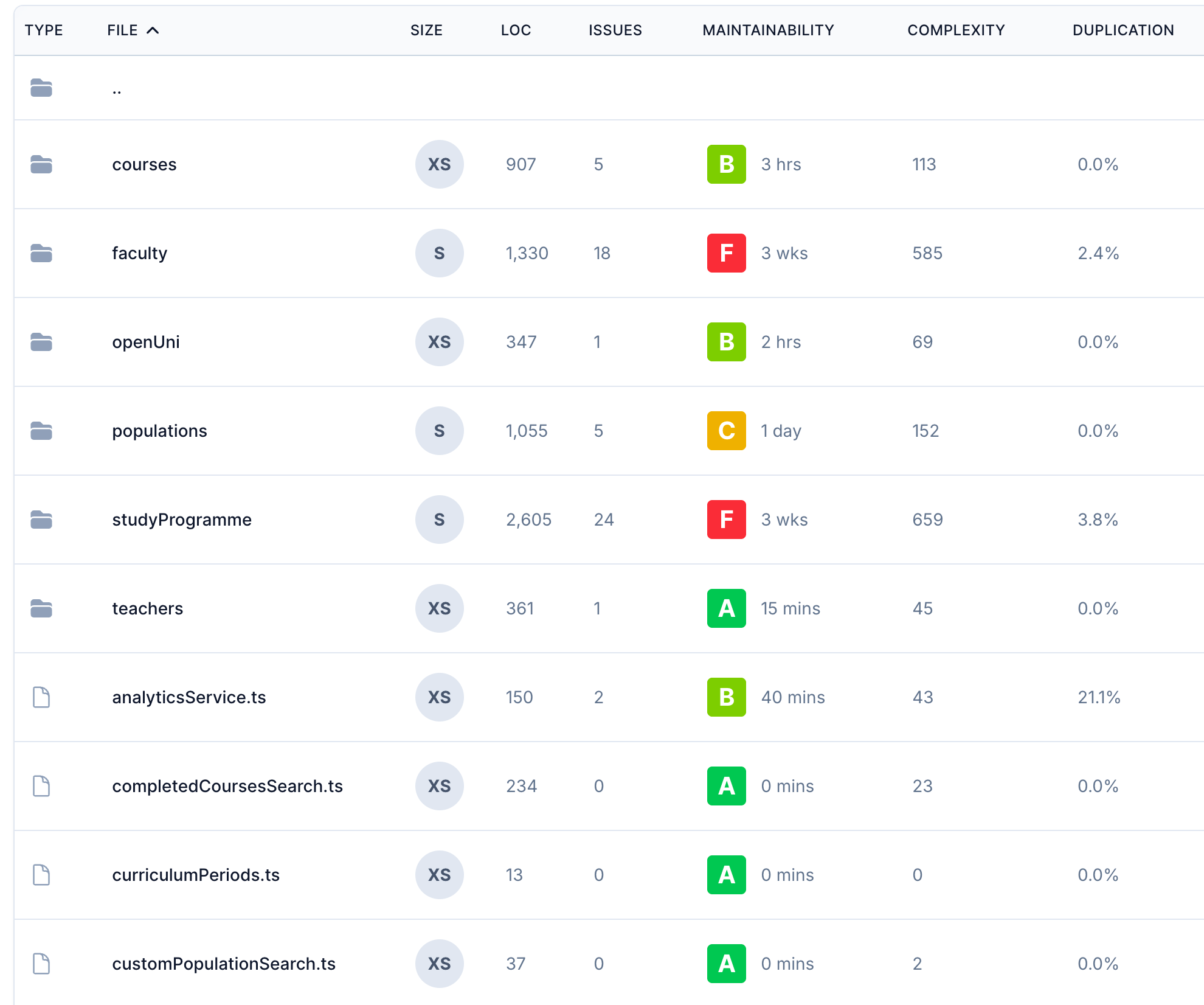 Qlty tarjoaa paljon erilaisia näkymiä. Koodin ylläpidettävyyttä voidaan tarkastella monella tasolla. Seuraava paljastaa, että hakemistoissa faculty ja studyProgramme oleva koodi kaipaa kenties parantelua:
