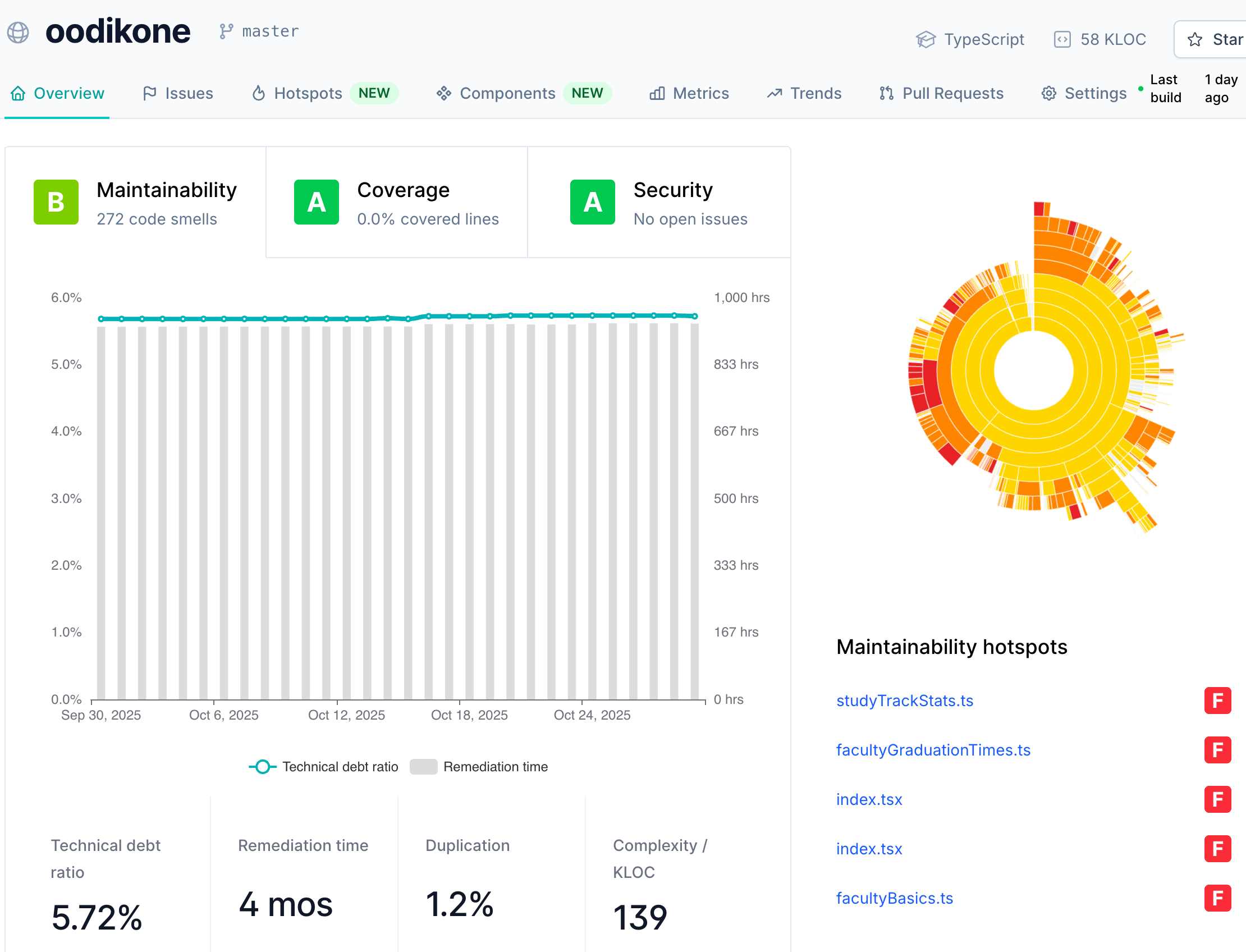 Sovelluksen ylläpidettävyyden arvosana on B, eli toisiksi korkein, tietoturvaan liittyviä ongelmia ei ole havaittu. Qlty arvioi sovelluksessa olevan teknisen velan takaisinmaksuajaksi vajaat 1000 tuntia. Oikealla oleva diagrammi näyttää sovelluksen koodin ylläpidettävyyden hotspotit, eli sovelluksen osat, jotka kaipaisivat eniten koodin huoltotoimia.