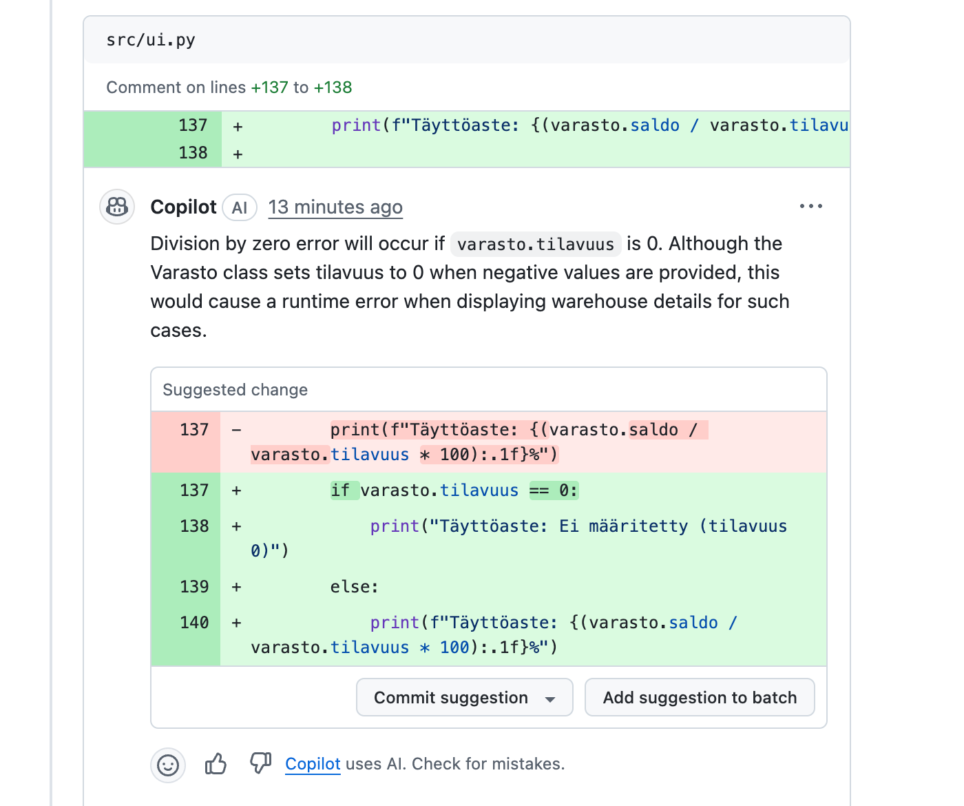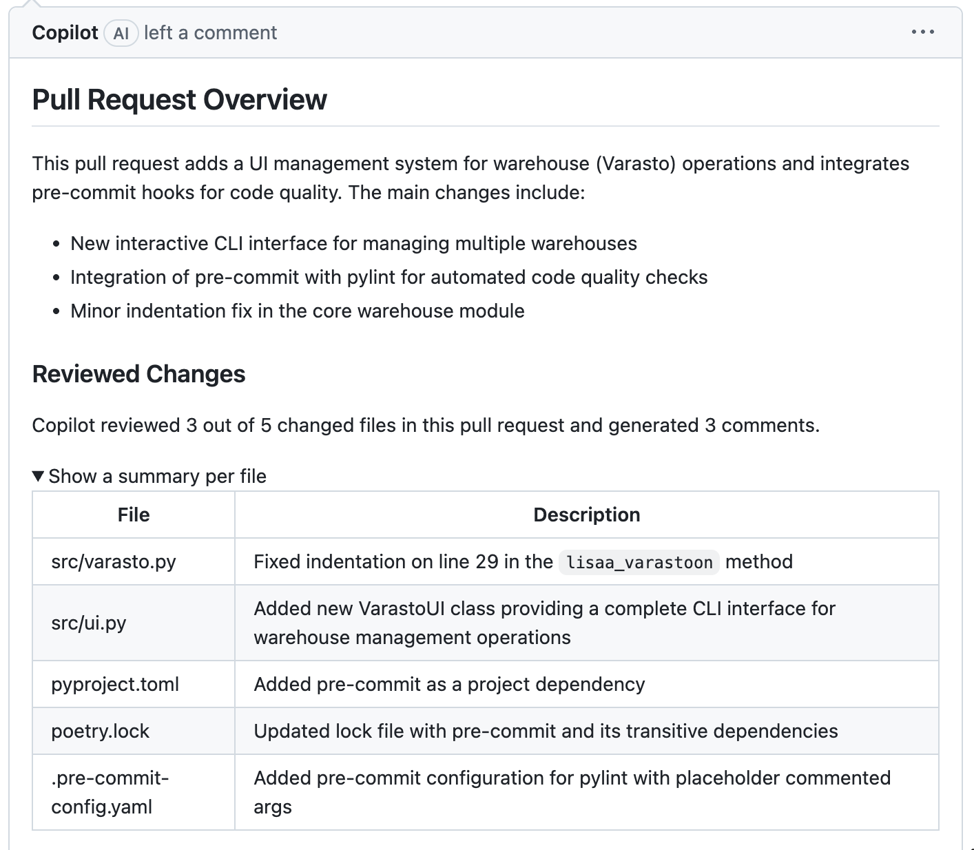 GitHubissa on mahdollista pyytää Copilotia tekemään koodikatselmointi pull requesteille. Vibe-koodasin ohtuvarastoon interaktiivisen käyttöliittymän, ja tein lisäyksestä pull requestin, jonka pyysin Copilotin katselmoimaan. Katselmoinnin yleiskatsaus näyttää seuraavalta