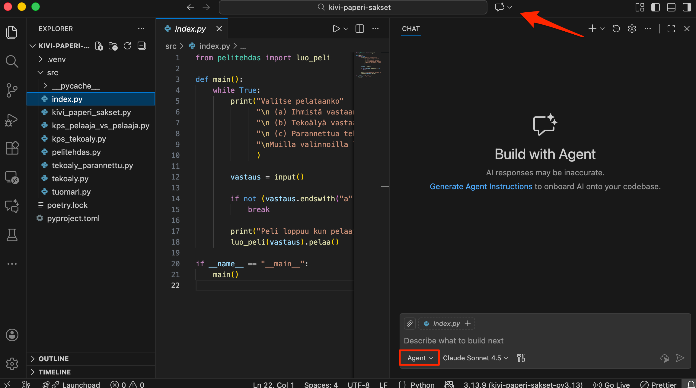 - ohjelma kannattaa suorittaa siten, että pyydät agentin käynnistämään sen, näin agentti osaa korjata koodin jos se ei jostain syystä käynnisty